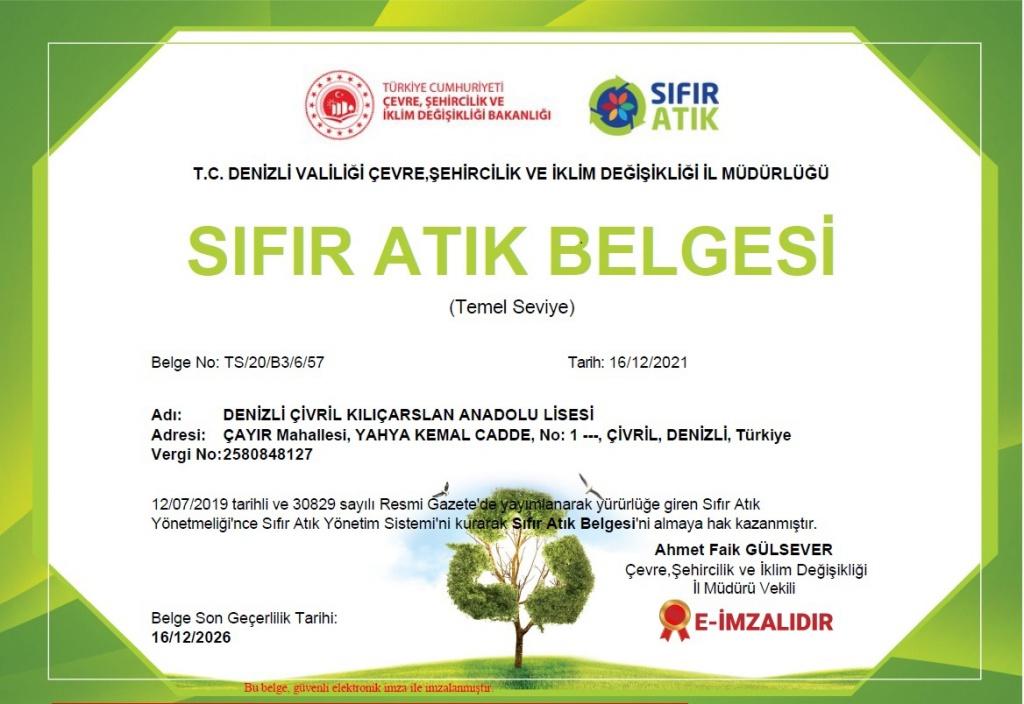 OKULUMUZ DOĞAYA VE ÇEVREYE KARŞI DUYARLILIĞININ VE HASSASİYETİNİN BİR GÖSTERGESİ OLARAK SINIF ATIK PROJESİNE BAŞVURMUŞ VE YAPILAN İNCELEMELER SONUCUNDA OKULUMUZUN SIFIR ATIK PROJESİNE UYGUN BİR OKUL OLDUĞU GÖRÜLMÜŞ VE OKULUMUZA ÇEVRE,ŞEHİRCİLİK VE İKLİM DEĞİŞİKLİĞİ İL MÜDÜRLÜĞÜ TARAFINDAN SIFIR ATIK BELGESİ VERİLMİŞTİR.